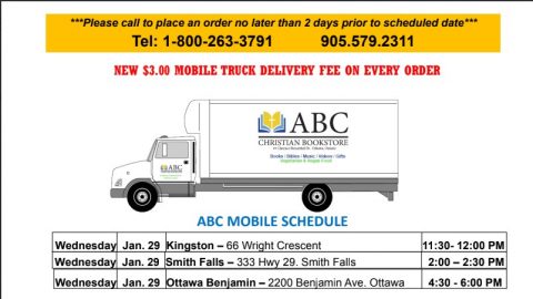 The ABC Christian Bookstore will be at the Ottawa Adventist Church Wednesday, January 29, from 4:30 p.m. to 6:00 p.m. Please call 1-800-263-3791 or 905-579-2311 to place an order no later than two days prior to the scheduled date. https://abcchristianbookstore.com/