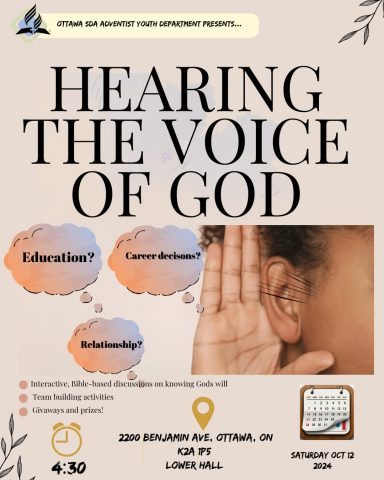 Join the Adventist Youth Ministries afternoon program at 4:30 p.m. as we delve into the riveting topic of hearing the voice of God! There will be interactive games and activities with powerful Bible discussions.