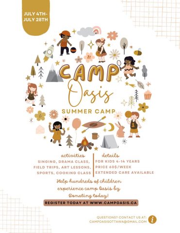 Register you child(ren) for Camp OASIS! There will be singing, drama class, field trips, art lessons and more. For kids 4-14 years old. The price is $60.00 per week and extended care will be available. Register today at www.campoasis.ca. If you have any questions, please email campoasisottawa@gmail.com