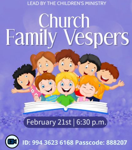 Church Family Vespers starting at 6:30 p.m. on Zoom. This month’s vesper will be led by Children’s Ministries. Come and be blessed as we welcome the Sabbath together! Please invite a friend.
