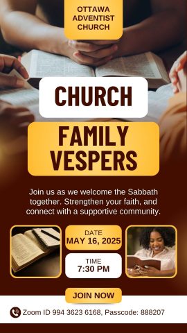 Join us for a blessed evening as we welcome the Sabbath together! This month, our cherished Elders will lead our Church Family Vespers. Invite a friend and come experience spiritual connection, fellowship, and heartwarming worship. We can't wait to see you there!