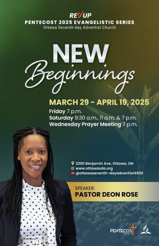 The “New Beginnings” Evangelistic Series, which began March 29, continues with Evangelist Pastor Deon Rose. The series is being held on Saturdays at 9:30 a.m., 11:00 a.m. and 7:00 p.m.; on Wednesdays at 7:00 p.m. and Fridays at 7:00 p.m. until April 19, 2025. Come and bring a friend. We encourage you to reach out to missing members and invite them as well.