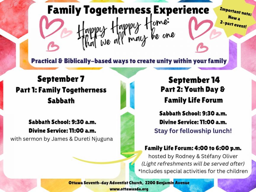 Family Togetherness Experience continues this Sabbath, September 14. 2024, with Youth Day, a fellowship lunch and a Family Life Forum in the church basement hall from 4:00 to 6:00 p.m. hosted by Family Life Ministries leaders, Rodney & Stéfany Oliver. They will lead us in an engaging time to connect, discuss and learn from each other as we discover practical and Biblically-based ways to create unity in our homes. Activities for the children will be organized, and light refreshments will be served after. Mark the dates and plan to attend. See the poster for details.