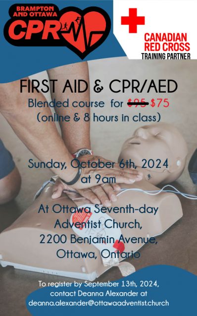 First Aid/cardiopulmonary resuscitation (CPR) Training beginning at 9:00 a.m. at the church. Participants will be equipped with the knowledge and skills necessary to respond immediately to an emergency. Topics include: how to assess the situation; CPR; how to treat burns, cuts, bruises, and use an automated external defibrillator (AED). Space is limited. Register by September 13. Send inquiries to deanna.alexander@ottawaadventist.church.