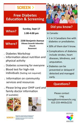Sunday, September 17: Free Diabetes Education & Screening from 1:00 p.m. to 4:00 p.m. at the Ottawa Adventist Church.