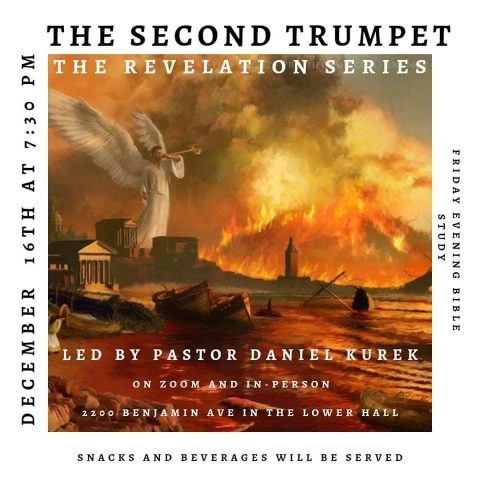 Join us this evening Friday, December 16 at 2200 Benjamin Avenue in the lower hall for the second trumpet Bible study! This riveting Revelation Bible study series will have you on the edge of your seat!