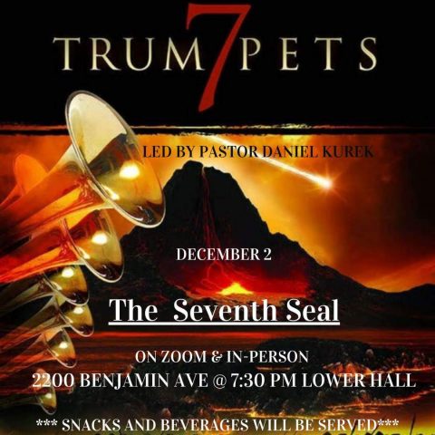 Join us this Friday, December 2, at 2200 Benjamin Avenue in the lower hall for the seventh part of our riveting Revelation Bible study series. We will discuss the seventh seal, the introduction to the 7 trumpets!