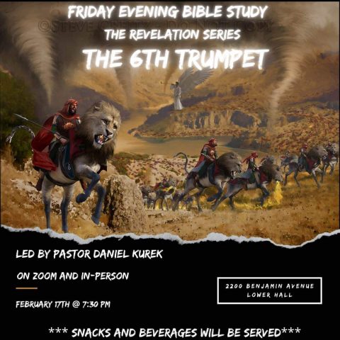 Join us this evening Friday, February 17 at 2200 Benjamin Avenue in the lower hall. This is the second part of a riveting Bible study where we will learn about the 6th trumpet. Start the Sabbath with us in the word!
