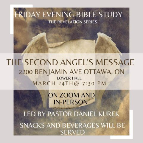Join us this Friday, March 24 at 7:30 pm at 2200 Benjamin Avenue in the lower hall. This will be a riveting Bible study where we will learn about the the first angel's message. Start the Sabbath with us in the Word!