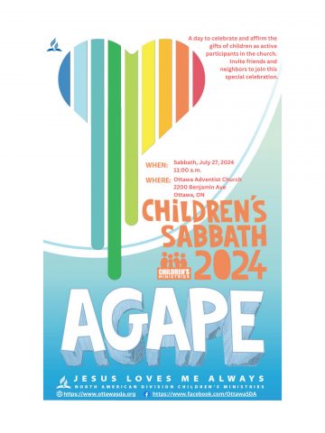 This Sabbath, July 27, is Children’s Sabbath - a day set aside by churches worldwide to highlight and affirm the gift and gifts of children in our midst. It is a day to celebrate children as active participants in the life of the church. Join us for the Ottawa Seventh-day Adventist Church worship experience, beginning with Sabbath School at 9:30 a.m. The children of the church lead out in the divine service under the theme “Agape Love.” On this special day, invite friends and neighbors to bring their children.