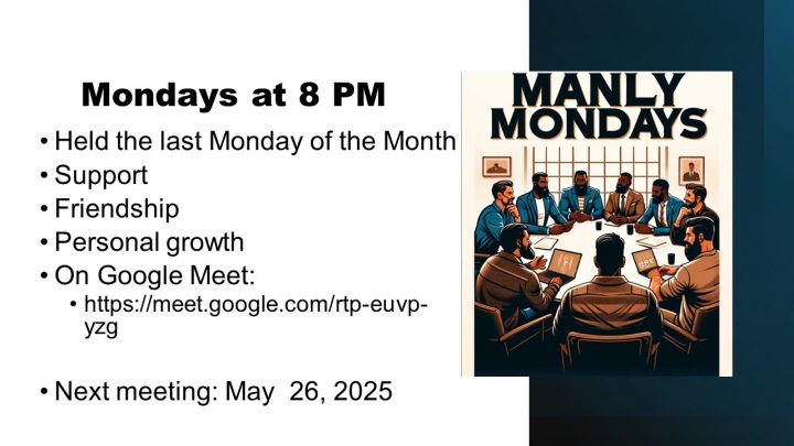 Brothers, Men’s Ministries invites you to get together for “Manly Mondays” every last Monday of the month at 8:00 p.m. on Google Meet (https://meet.google.com/rtp-euvp-yzg); It is a great opportunity to connect with like-minded men, grow in faith, build friendships, and support each other.