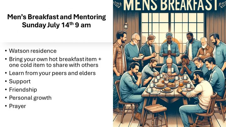 Join us for Men’s Breakfast at the Watson’s residence. Bring your own hot breakfast item and one cold item to share with others. Come out for friendship, personal growth, support and prayer.