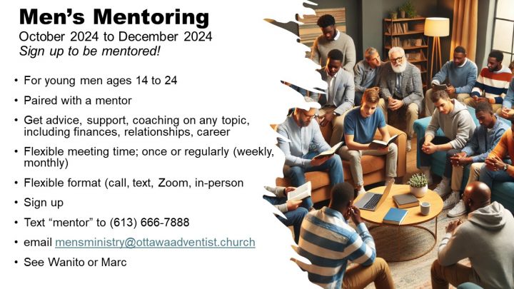 October to December 2024: Men’s Mentoring: You asked and God delivered! Are you a young man 14-29 years old? Men's Ministries invites you to get a male mentor. You will be paired with a mentor who will offer advice, support and coaching on any topic including faith, finances, relationships, career, etc. Meetings are flexible; you can meet once or regularly via phone call, text, Zoom, in-person, weekly or monthly. Please sign up by texting the word “mentor” to 613-666-7888, emailing mensministry@ottawaadventist.church, or seeing Wanito or Marc. The Men’s Mentoring will run from October – December.