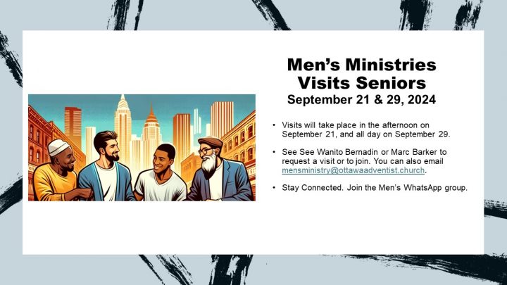 Men’s Ministries will be visiting seniors in the afternoon on the 21st and all day on the 29th. Please see Wanito Bernadin or Marc Barker to join or request a visit. You can also email: mensministry@ottawaadventist.church