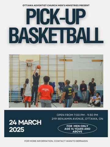 Men, come enjoy an evening of pick-up basketball, from 7:00 p.m. to 9:30 p.m. at 2191 Benjamin Avenue (Ottawa Adventist School Gym). Drop-in to play or connect. All ages above 14 years welcome. Refreshments will be available.
