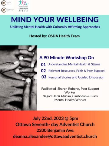 In the afternoon of Sabbath, July 22, the Ottawa Adventist Church Health Ministries is hosting a targeted Mental Health Workshop “Mind Your Wellbeing” from 5:00PM to 6:30PM in the church fellowship hall. Faith, lived experience and culturally affirming tools will be explored.