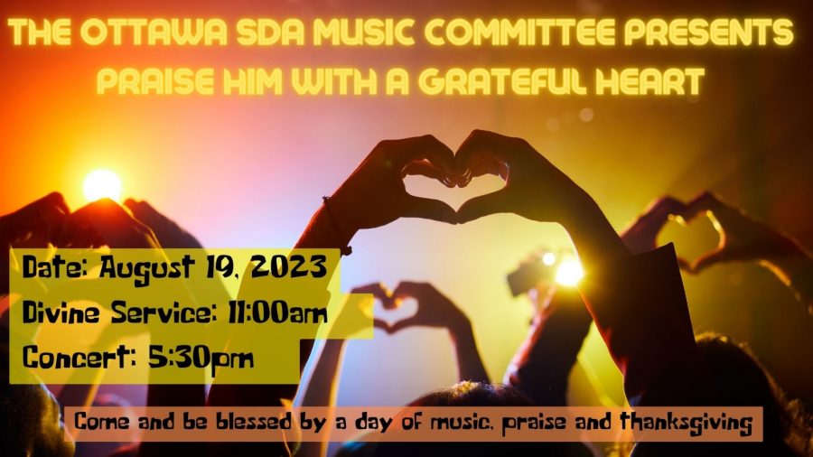 In the afternoon, the Ottawa Adventist Church Music Committee presents “Praise Him with A Grateful Heart” concert at 5:30 p.m.