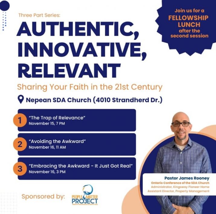 This Sabbath we join with the Nepean Adventist Church in the divine service message. Guest speaker Pastor James Rooney, Associate Director Property Management, Administrator Kingsway Pioneer Home, will address authentic, innovative and relevant ways to share our faith in a Canadian context. This information is beneficial as we seek to mobilise our intergenerational congregation in evangelism, and establish the highest sense of relevance as we do so. At 3:00 p.m., join the Nepean Adventist Church (4010 Strandherd Drive.) in person, or on line for the workshop on this relevant subject.