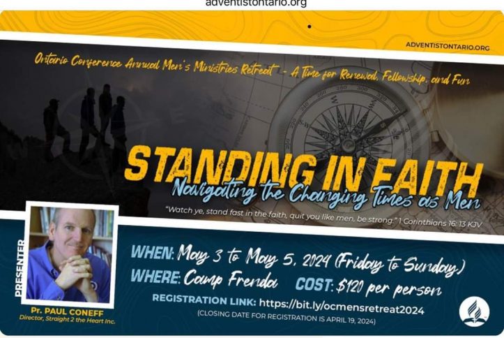 Men’s Ministries encourages men to attend the Ontario Conference Annual Men’s Retreat taking place May 3 to 5 at Camp Frenda. Each brother is responsible for his own registration and cost. Registration link: https://form.jotform.com/240445508987265. Registration closed April 19.