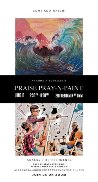 The Ottawa Adventist Church Youth Committee invites you to come and paint with us. The Canadian National Champion ( 2016, 2019) Allan André will walk you step-by-step on how to draw a Biblical painting while praising and singing along to Christian music.