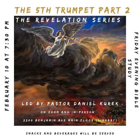 Join us this evening Friday, February 10, 2023, at 2200 Benjamin Avenue in the lower hall. This is the second part of a riveting Bible study where we will learn about the 5th trumpet. Start the Sabbath with us in the word!
