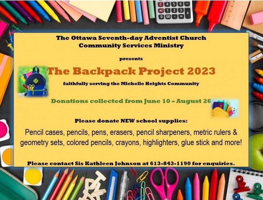 Annual Community Services’ Backpack Project. Donations of pencil cases, pencils, pens, erasers, pencil sharpeners, metric rulers, and more, to help our friends in the Michele Heights Community, can be dropped off until August 26 in the box under the TV in the foyer. For any inquiries, contact Kathleen at 613-843-1190.
