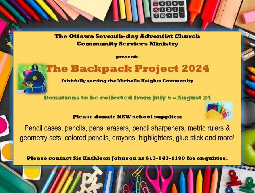 Community Services Department is accepting donations of pens, pencil cases, rulers and other school supplies until August 24, which helps children in our community by providing them with the tools they need to start the new school year. Donations can be placed in the designated bin in the church foyer. For enquiries, contact Kathleen at 613-843-1190.