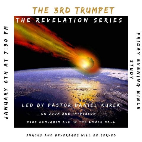 Join us this Friday January 6 at 2200 Benjamin Avenue in the lower hall for the first Bible study of the year! This will be a riveting Bible study where we will learn about the 3rd trumpet. Start the year right in the Word!