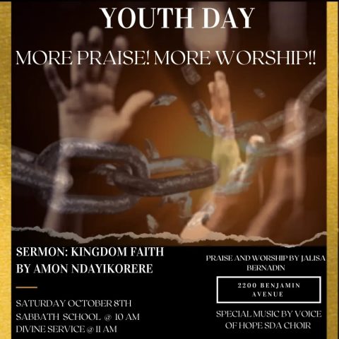 10:00 AM Sabbath School: Song service by Lena Niyikiza followed by the Sabbath School lesson with Bontu Kussi and Baptista Shimwe.