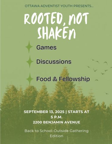 In the afternoon, plan to attend the Adventist Youth program "Rooted, Not Shaken" - a back-to-school outside gathering A.Y. edition featuring games, discussions, food and fellowship.