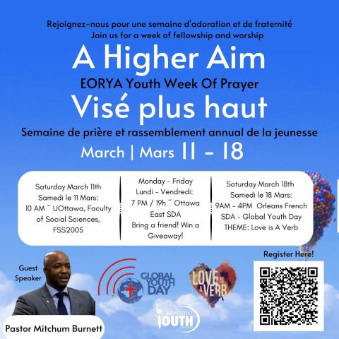 Join us this week for the Eastern Ontario Regional Youth Association Youth Week of Prayer, March 13-17 @ 7pm, with guest speaker Pastor Mitchum Burnett.